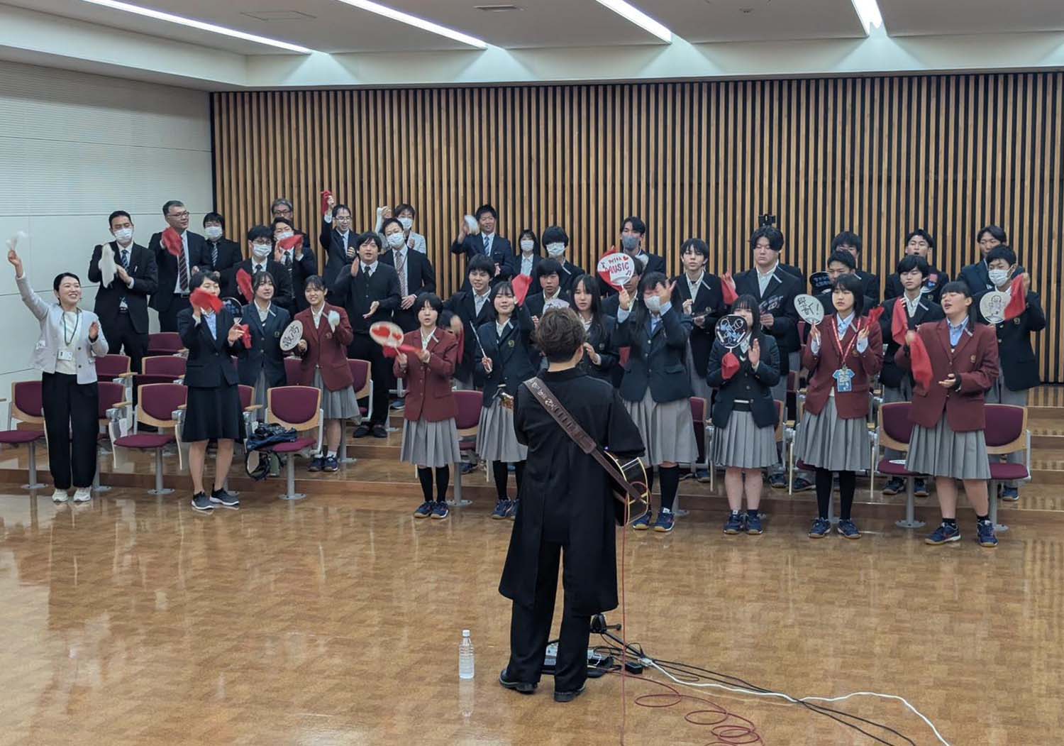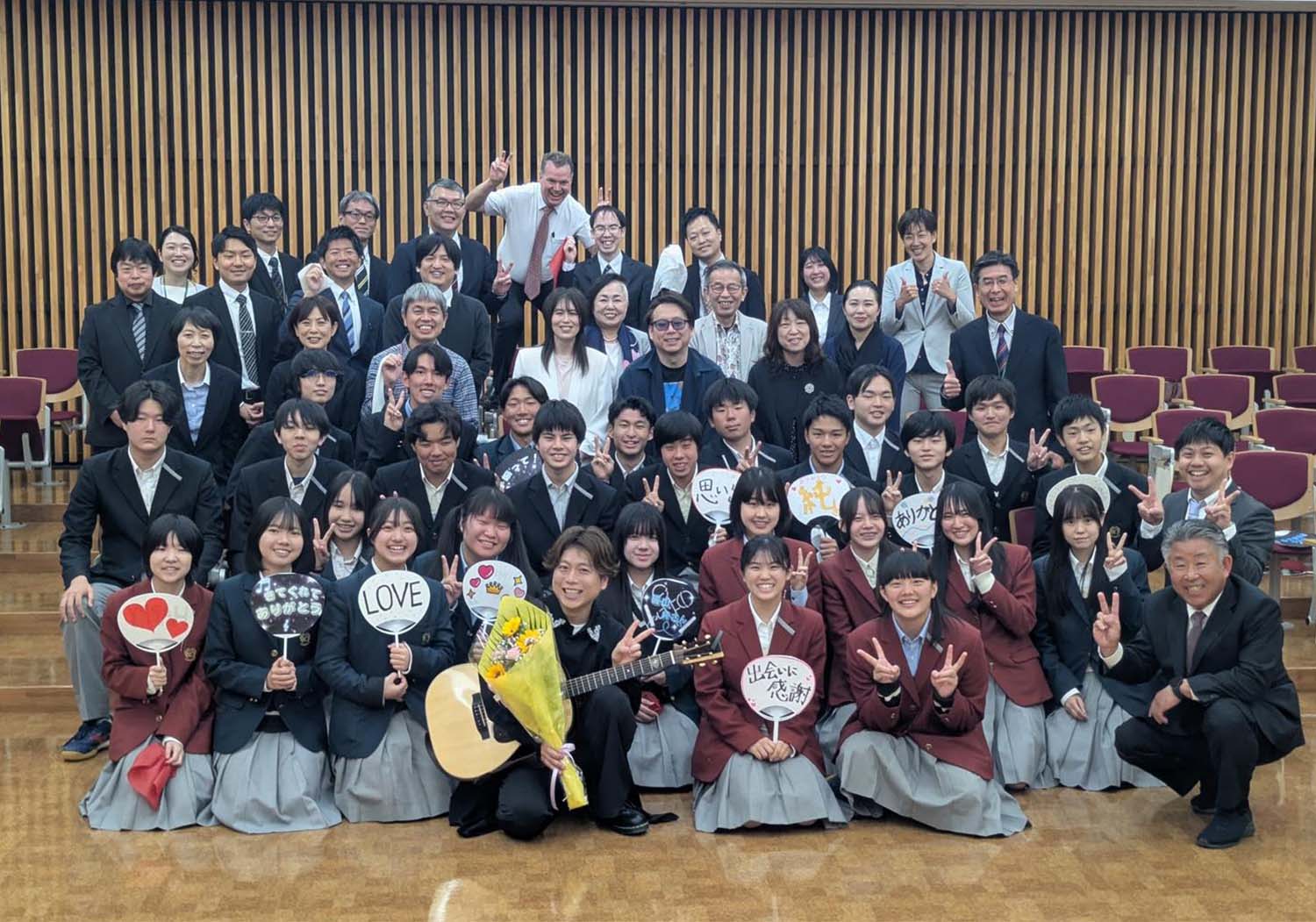 4月18日(土)に、磯山純さんに来校していただき、本校生対象のコンサートを開催していただきました。磯山さんは、コンサートに向けて生徒会の生徒たちと事前に話し合いを持ってくれて、生徒たちの智学館への想いを載せた曲を、当日披露してくださいました。とても感動的な曲です。大切にしていきたいです。
